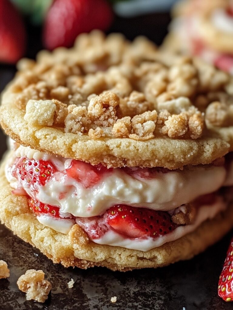 There are plenty of fun ways to personalize these cookies. You could flavor the cream cheese filling with a little lemon zest or swap in freeze-dried raspberries instead of strawberries. Want a chocolate version? Try adding cocoa powder to the cookie dough and coating the cookies with crushed chocolate sandwich cookies.