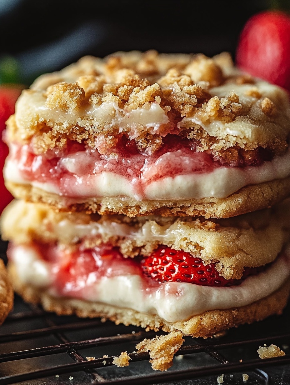 There are so many reasons why this recipe is a must-try. First, the texture is unbeatable—soft, chewy cookies with a crunchy topping and a luscious cheesecake center. That surprise creamy filling adds a delightful contrast that turns a good cookie into a great one. The strawberry flavor is vibrant, fruity, and pairs so well with the tangy cream cheese core.