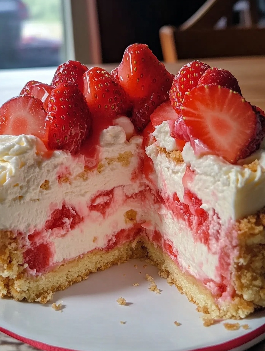This dessert brings together two of the most beloved sweets in one irresistible creation. You get the dense, creamy texture of cheesecake layered with the fluffy, tender crumb of vanilla cake. Add in sweetened strawberries and a whipped topping, and the result is a dessert that’s fresh, indulgent, and visually stunning.