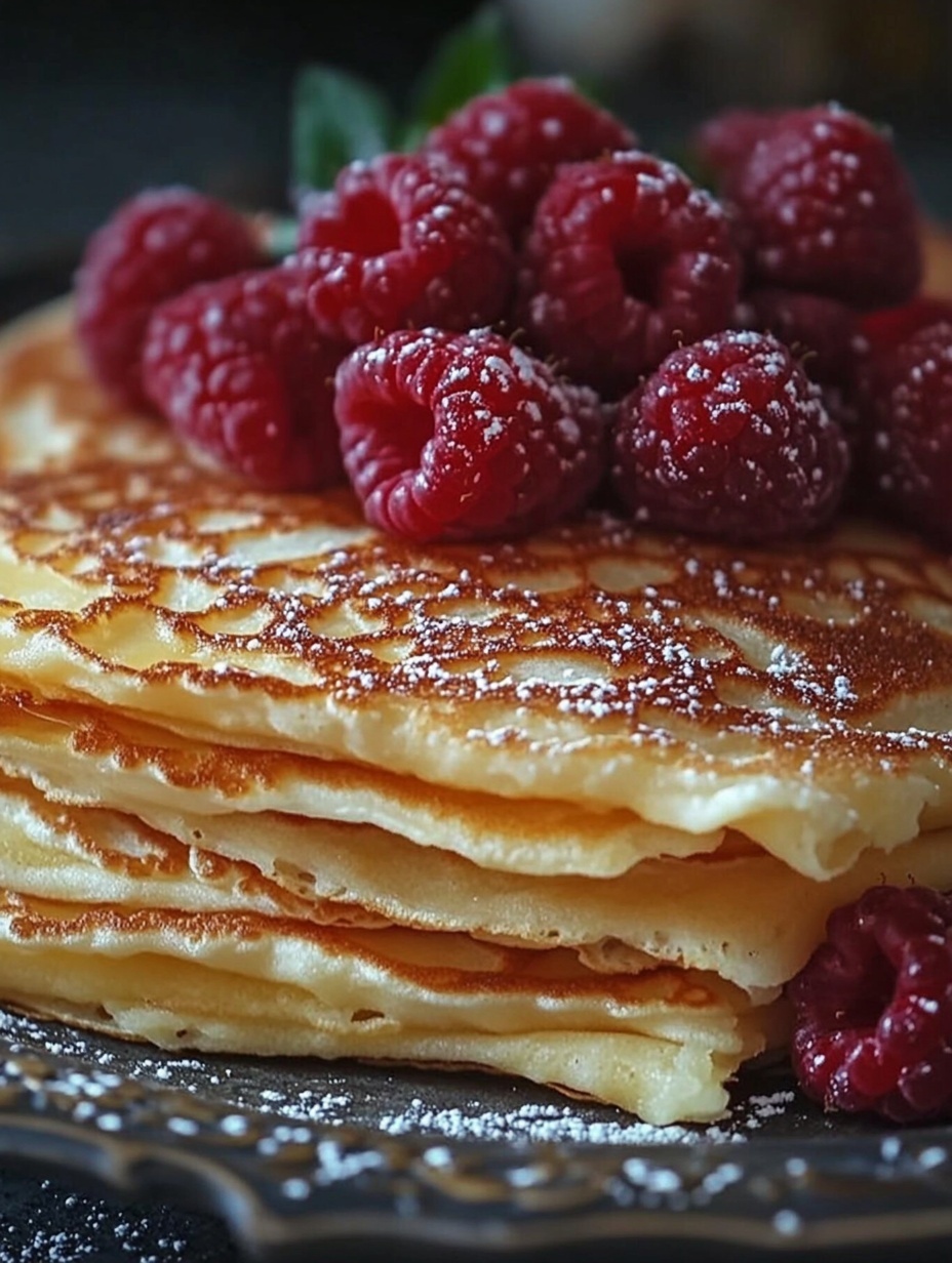 These classic French crêpes are light, tender, and easy to make at home. Paired with fresh raspberries and a dusting of powdered sugar, they make a delightful breakfast, brunch, or dessert. With simple ingredients and quick preparation, this recipe is both elegant and practical.