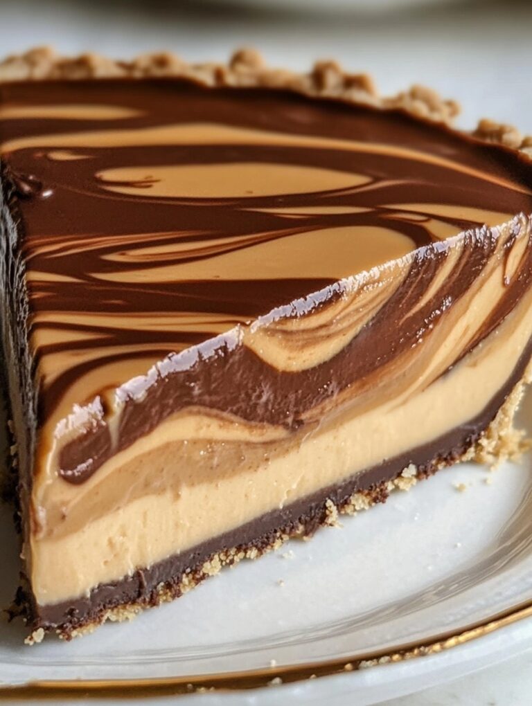 Assemble the pie layers: Pour half of the chocolate ganache into the cooled crust and spread it evenly. Carefully spoon the peanut butter mixture over the chocolate layer, smoothing it gently. Pour the remaining chocolate ganache over the top and use a knife or skewer to create a swirling pattern by dragging it lightly through both layers.