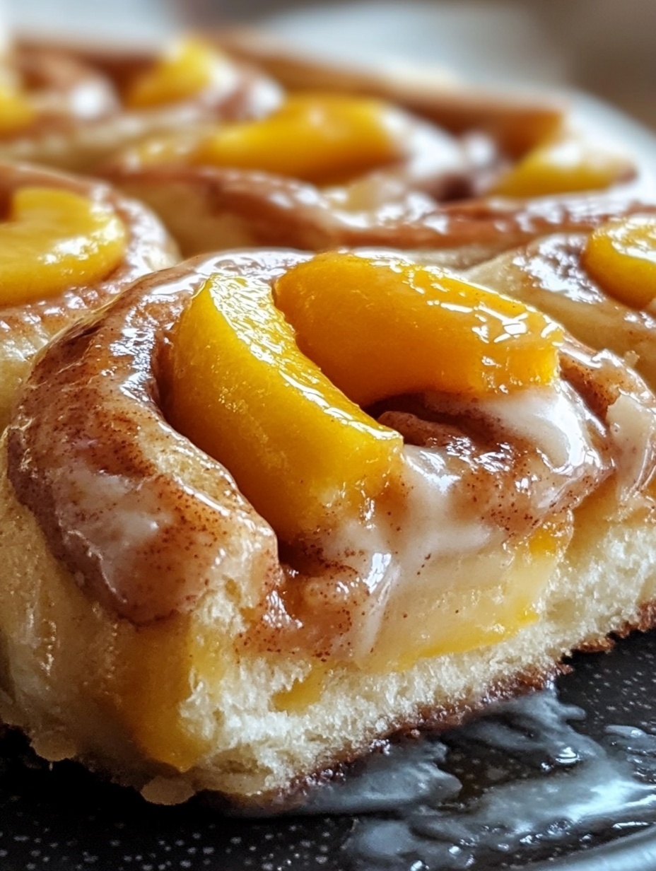 - Preheat oven to 350°F (175°C). Bake rolls 25–30 minutes until golden brown and peach filling is bubbly. Cool 10 minutes before glazing.