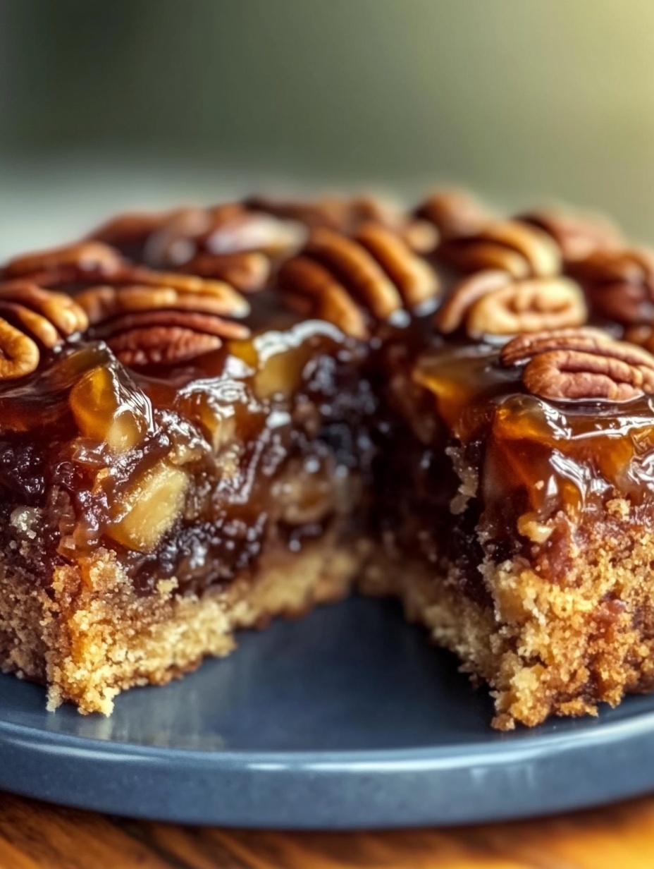 Allow the cake to cool in the pan for 10-15 minutes. Then, gently run a knife around the edges to loosen it. Place a serving plate upside down over the cake pan and carefully flip the cake onto the plate. The pecan topping will now be on top, glossy and caramelized.