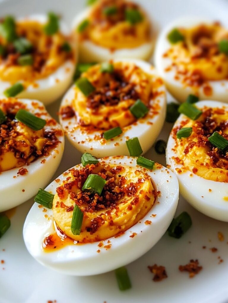 Each ingredient plays a role in creating the perfect balance of creaminess, spice, and flavor depth. The eggs provide a neutral base, while the mayonnaise and mustard add richness. The chili garlic sauce and fresh garlic bring bold, zesty notes, and the garnish gives a pop of color and subtle aroma. Together, they create a deviled egg that is both comforting and exciting—simple enough for everyday snacking but impressive enough for special occasions.