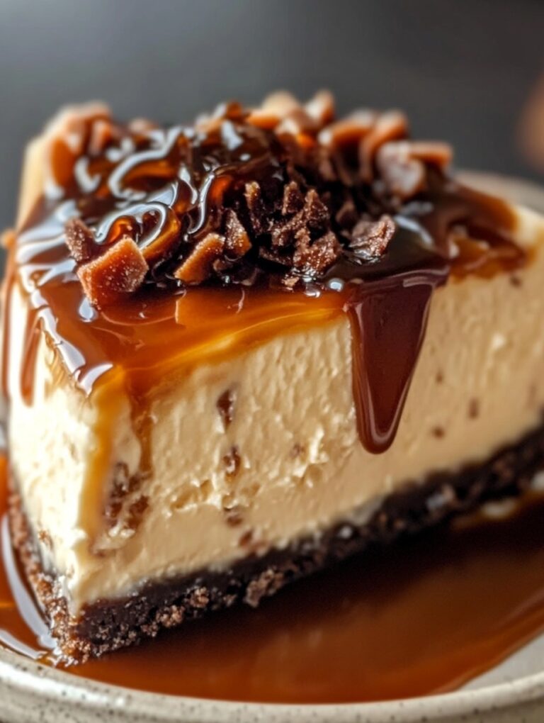 Once the caramel has set slightly, slice the cheesecake using a sharp knife dipped in hot water for clean cuts. This dessert pairs wonderfully with fresh fruit, whipped cream, or chopped nuts for added texture.