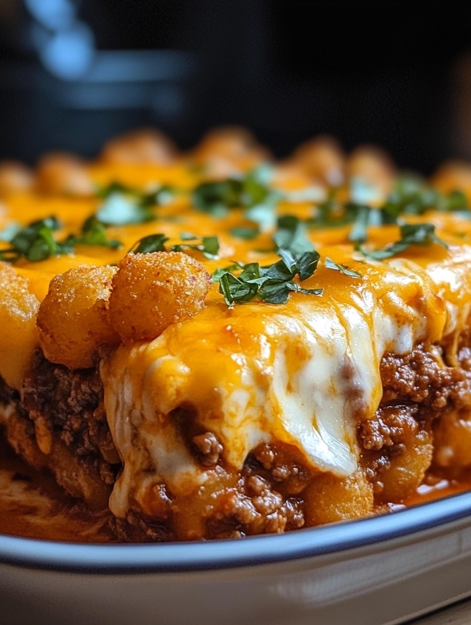 12. Bake uncovered for 25–30 minutes, until cheese is melted and tater tots are golden.