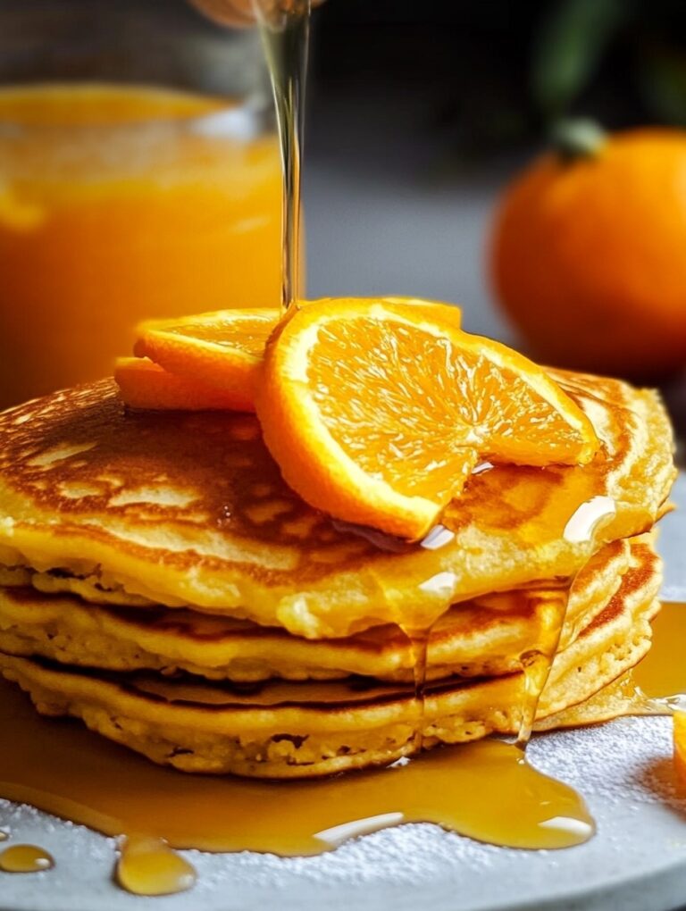 Stack the warm pancakes on a serving plate, then pour the hot orange syrup generously over the top. You can garnish with extra orange zest or a few slices of fresh orange for an elegant presentation. Serve immediately for the best taste and texture.