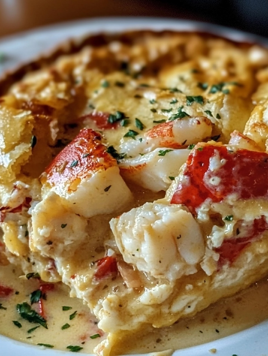 Allow the pie to cool for 5–10 minutes before serving. This helps the filling set slightly and prevents burns when cutting into it. Serve hot and enjoy every creamy, lobster-filled bite.