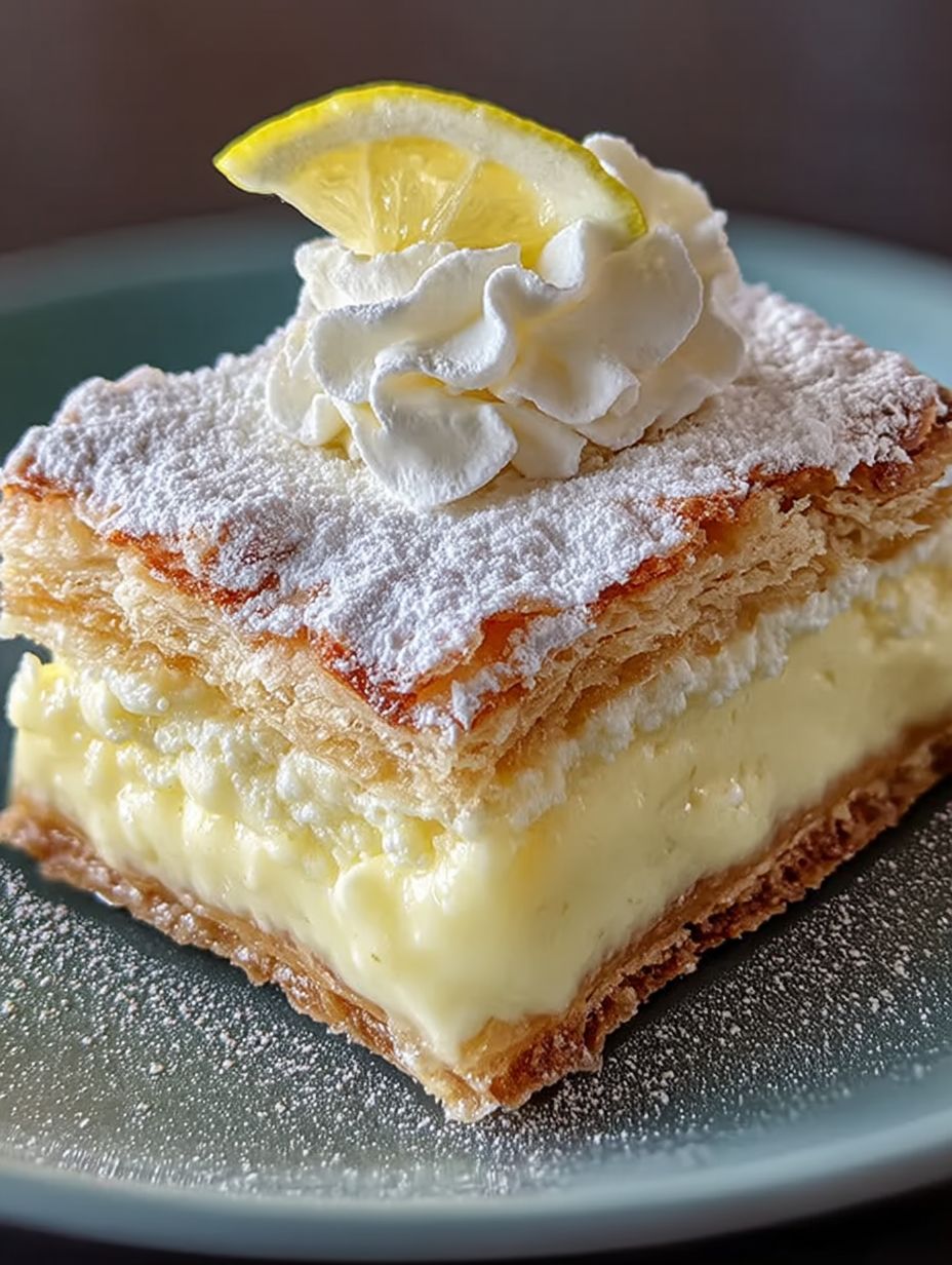 Imagine sinking your fork into a creamy, luscious layer of vanilla custard, resting atop crisp pastry that shatters like a well-kept secret in your mouth. Each bite is a delightful dance of sweet and rich flavors that would make anyone weak at the knees.