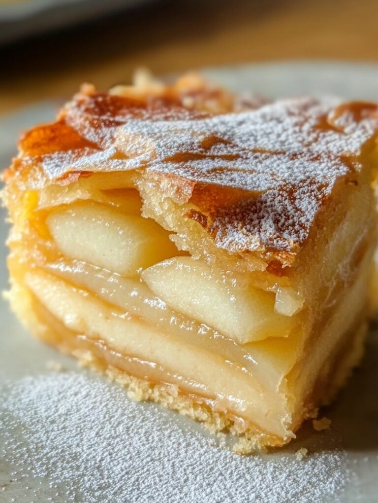 When the cake has cooled, dust the top with a light layer of powdered sugar for an elegant finish. Slice gently with a sharp knife to reveal the delicate, translucent layers of apple. Serve at room temperature or slightly chilled. It pairs wonderfully with a dollop of whipped cream, a drizzle of caramel sauce, or a simple scoop of vanilla ice cream.