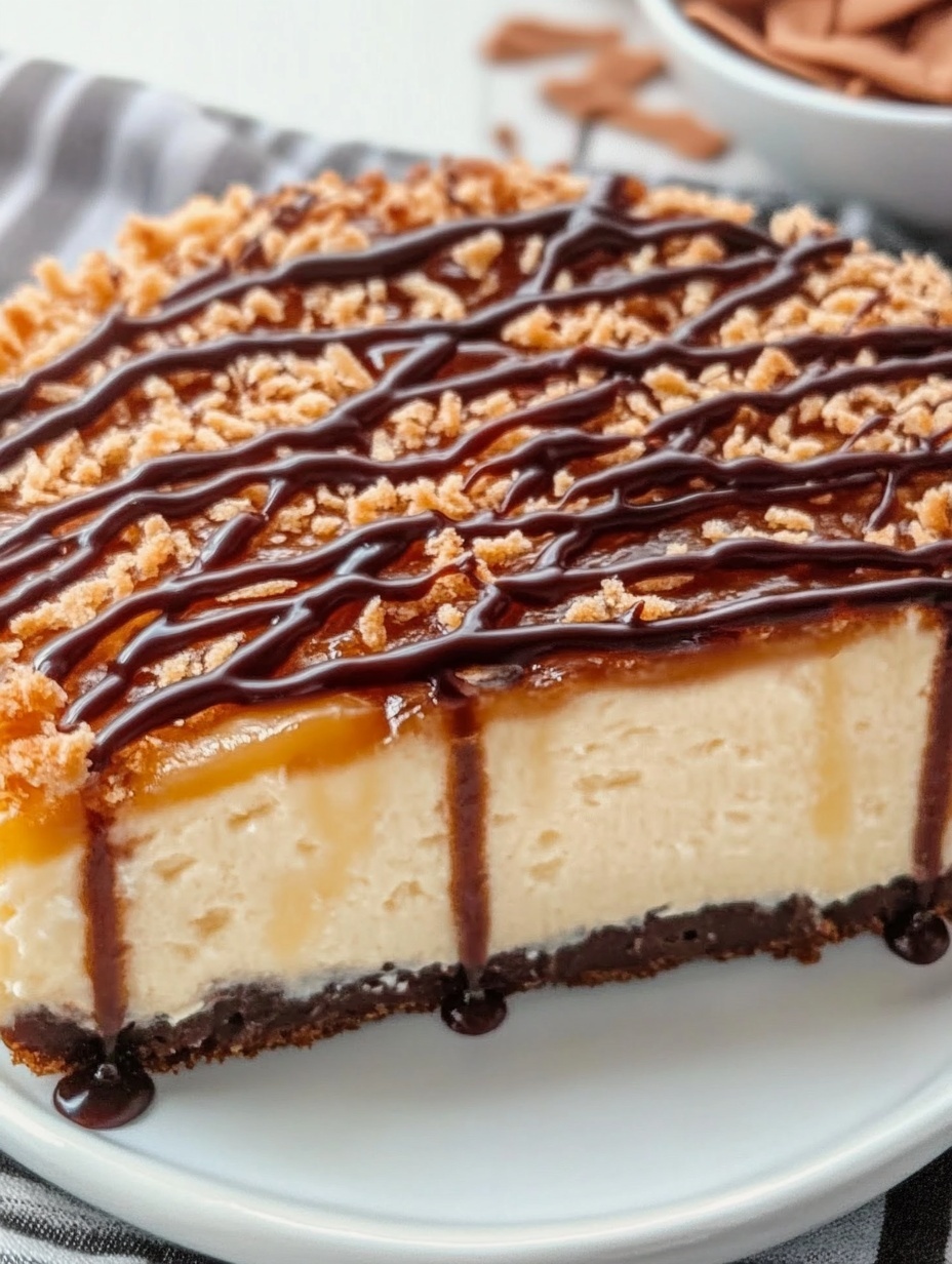 - Add toppings: Spread caramel sauce evenly over the cheesecake. Sprinkle toasted coconut on top. Melt chocolate and drizzle over the cheesecake in thin ribbons.