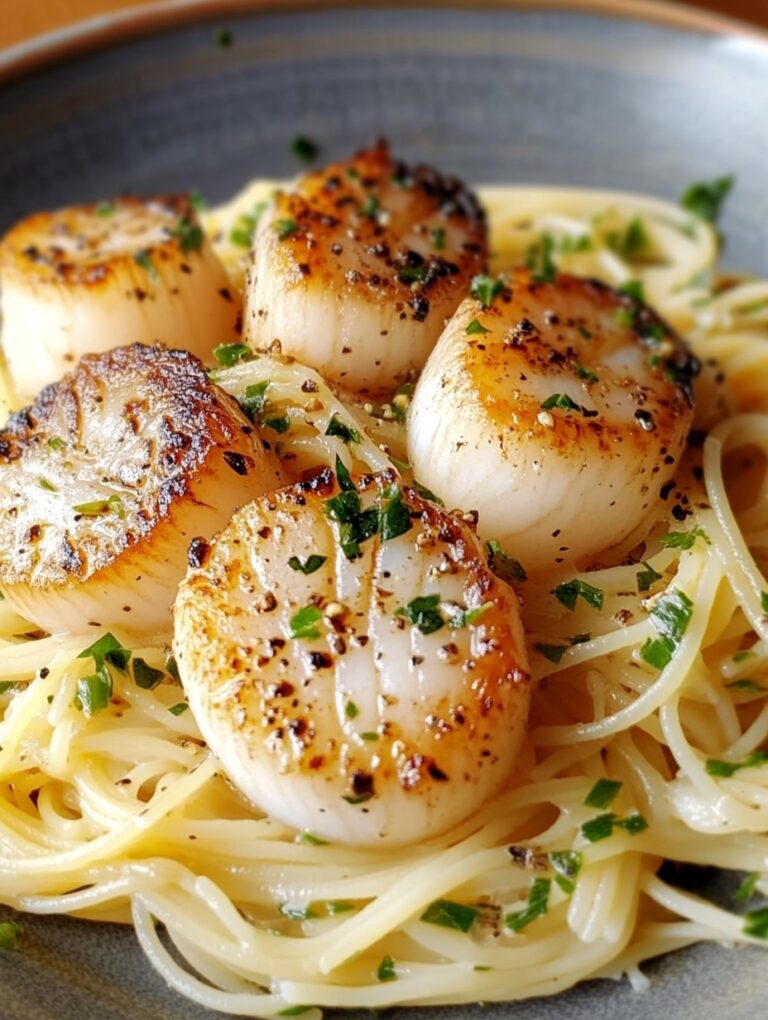 Finally, return the seared scallops to the skillet, placing them on top of the pasta without stirring too vigorously, so they stay intact. Sprinkle with chopped fresh parsley for a bright, fresh finish. Serve immediately while hot, allowing the natural flavors of the scallops to shine alongside the delicate pasta.