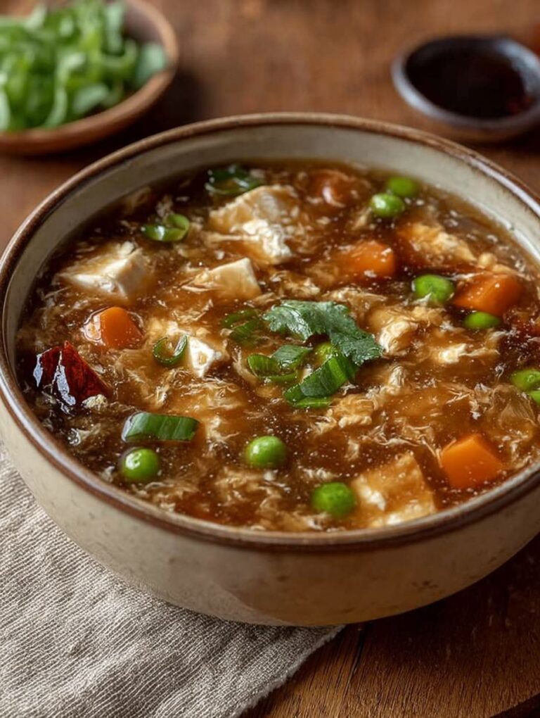 Once everything is heated through, remove from heat. Ladle your beautiful Hot and Sour Soup into bowls, sprinkle chopped green onions on top, and serve immediately while it’s piping hot! Enjoy the warmth as it revitalizes you from head to toe—perfect after any long day or study session!