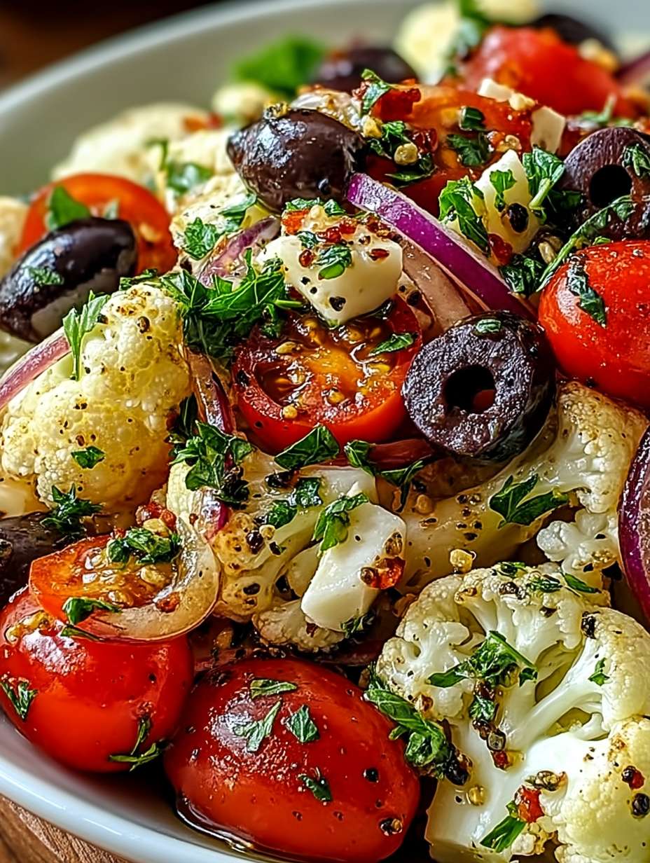 Delicious mediterranean marinated cauliflower salad recipe with detailed instructions and nutritional information.
