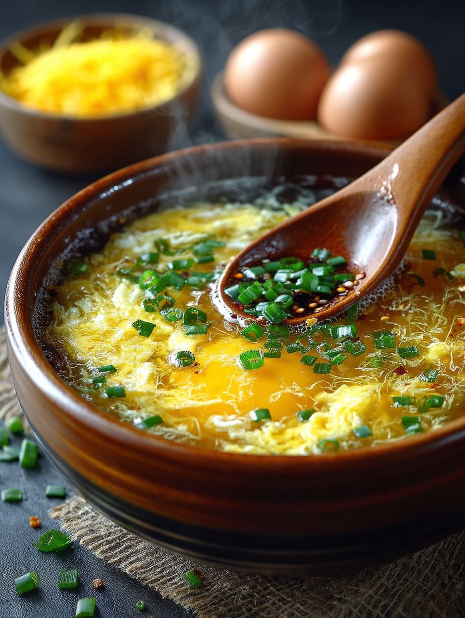 Imagine a steaming bowl of velvety egg drop soup, where silky ribbons of egg swirl gracefully in a light, flavorful broth that’s kissed by ginger and garnished with vibrant green onions. Each spoonful is a delightful harmony of warmth and comfort, something that makes your taste buds do a little happy dance.