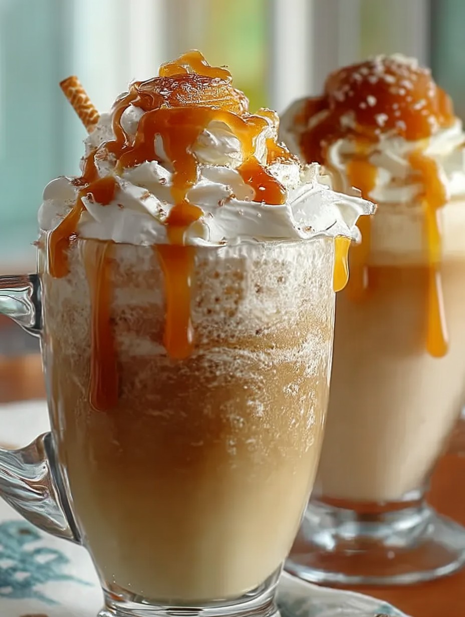 Pour the blended mixture into tall glasses—make sure they’re fancy enough because presentation matters! Top generously with whipped cream and drizzle more caramel sauce over the top like you’re an artist finishing their masterpiece.