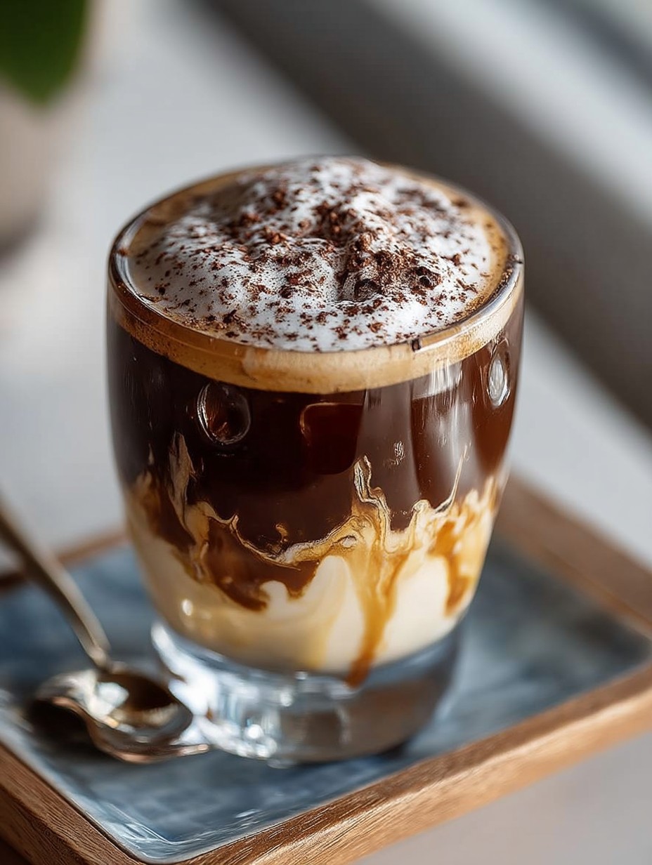 Carefully pour your brewed coffee over the sweetened condensed milk mixture while giving it a gentle stir with a spoon. You want those two layers to mingle but not completely blend—let some visual magic happen here!
