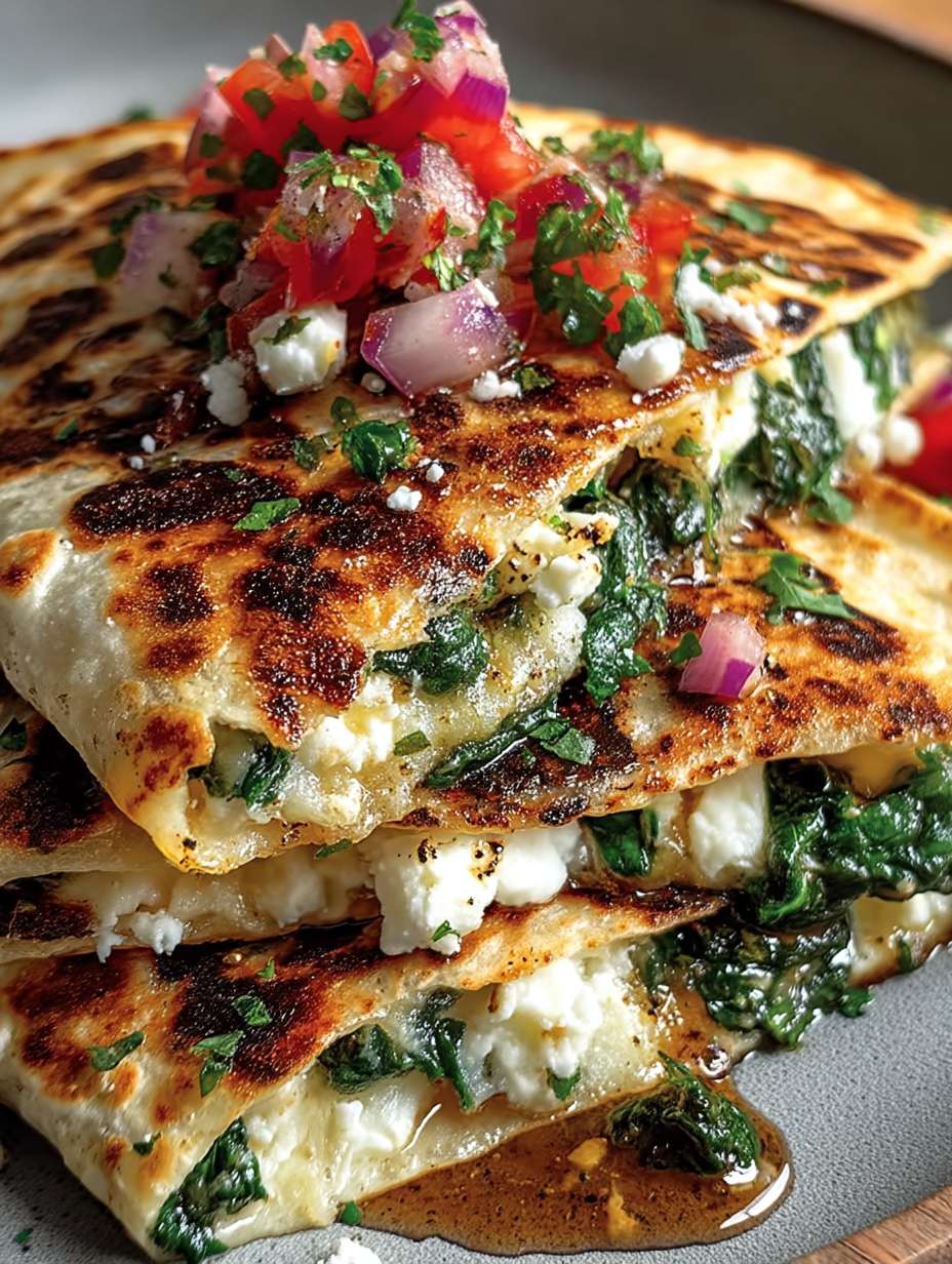 For the Mediterranean Quesadillas with Spinach, Feta, Mozzarella, and Red Onion, start by sautéing the spinach until wilted. Layer your cheeses evenly before folding the tortilla to ensure every bite is cheesy goodness. Cook over medium heat for a perfectly crisp exterior.
